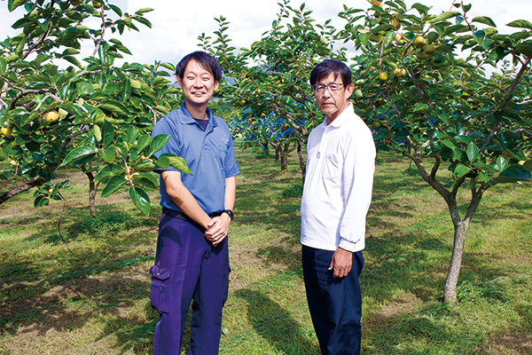 14年程前から本格的に農業に取り組み、梨を栽培・出荷していた猛さん。5年前、耕作が放棄され荒れていた柿畑を借り入れ「柿園」にしました。柿園は市内のボランティアスタッフといっしょに手入れを行っています。栽培の中心は猛さんが担い、雑草を刈る作業や収穫作業などはボランティアスタッフといっしょに行います。ボランティアスタッフは大自然の中農作業で汗を流し、地元産のカキを自宅用や知人への贈りものとして用意してもらえます。木の高さも全員が作業しやすいように少し低めにしてあります。もともと荒地だった場所が、「集う場所」に変わったそうです。