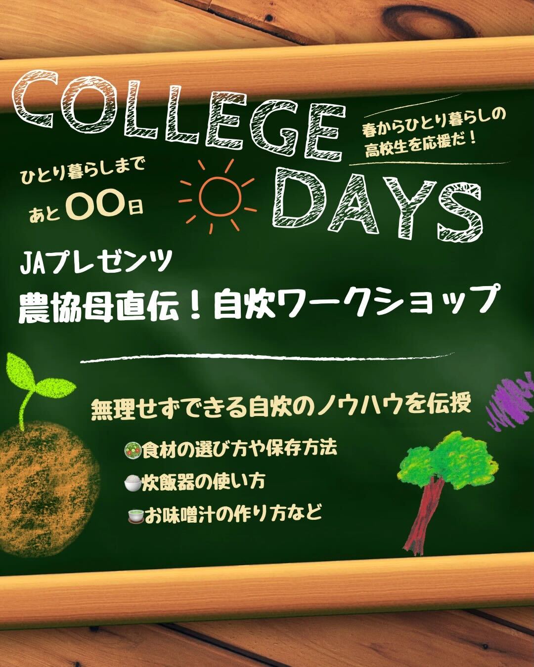 一人暮らし準備・自炊ワークショップ「COLLEGE DAYS」を3月下旬に企画しており、この企画へのニーズやご意見を伺っています。